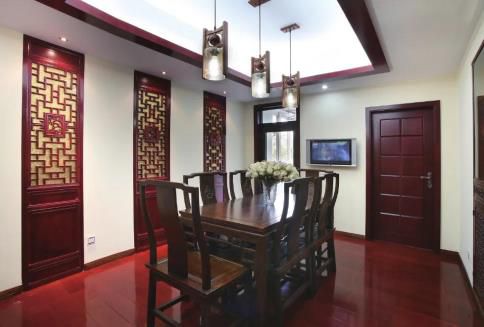 ▲棕赤色的實木門與空間的中式樣式完善匹配,統(tǒng)一了空間的總體色彩。
