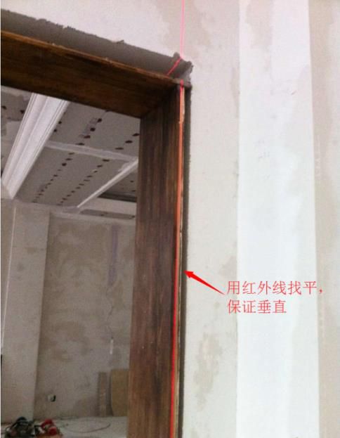 都做好后,就能夠?qū)㈤T套往門洞里裝載了。先用紅內(nèi)線儀找平和垂直,確保門套裝載的橫平豎直。還要找好門套與門洞前后左右的距離。