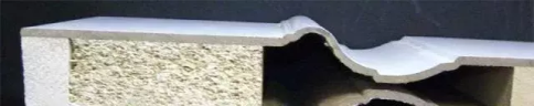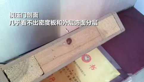 模壓門從截面就能一眼看出框架優(yōu)劣。像下圖的這個框架就是實(shí)木廢物碾碎膠粘而成,用料相當(dāng)差。面板層覆了一層幾乎能夠忽視不計(jì)的PVC膜