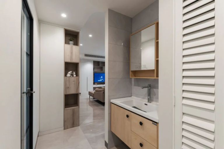 把衛生間的洗手臺外置到過道區域,是一個很有智慧的設計,可以大幅提升衛浴使用效率!如果你家的面積不大,只有一個衛生間且居住人口較多,那么就強烈推薦把洗手盆外置到過道上!這樣設計的話,早上大家急著出門時,有人上廁所,其他人也不用干等著,可以現在洗手臺刷牙洗臉。