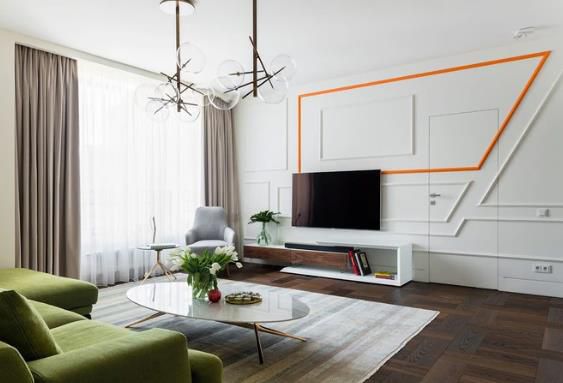 客廳電視架設(shè)計(jì)獨(dú)特,感覺就像一個(gè)無縫的塊。不僅電視架,甚至墻壁都被照亮,將娛樂區(qū)變成客廳中最令人印象深刻的地方。