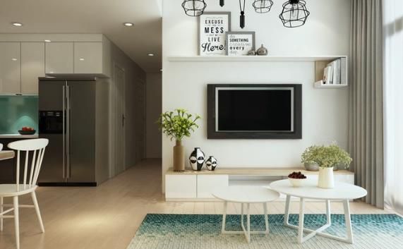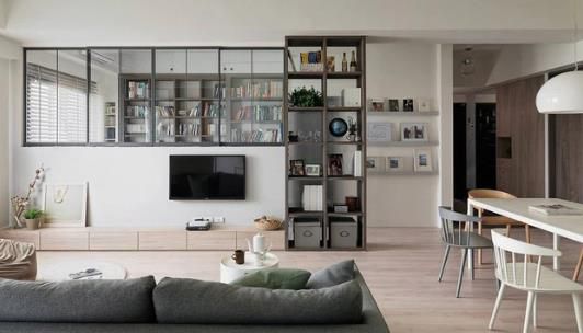 簡(jiǎn)約的電視柜搭配獨(dú)特的書架。客廳看起來既寬敞又通風(fēng),簡(jiǎn)單而整潔的電視架和透明的鋼化玻璃可以捕捉到所有的自然光。